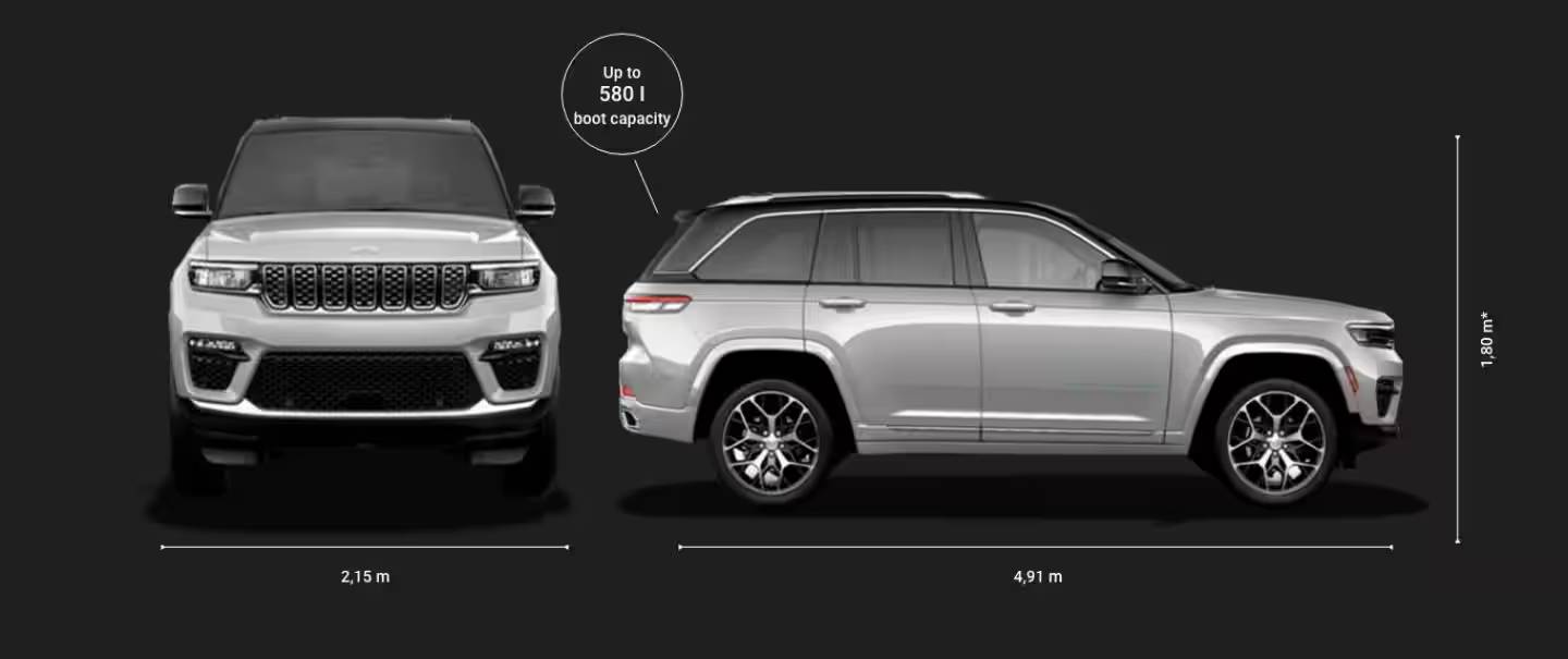 Jaunais Jeep® Grand Cherokee piedāvā komfortu un vietu, kas nepieciešama ikvienam piedzīvojumam. Tā augstums ir līdz 1,80 m, garums 4,91 m un platums 2,15 m.