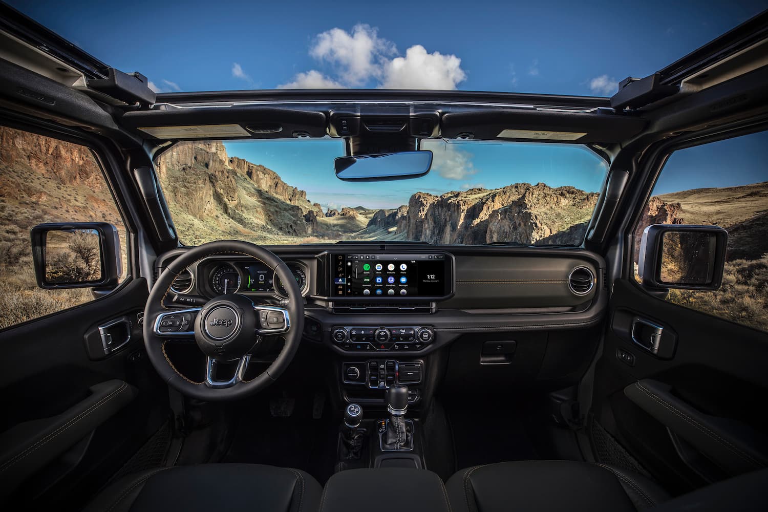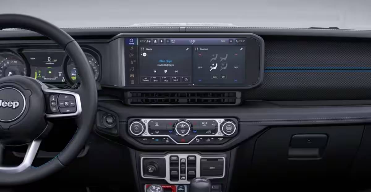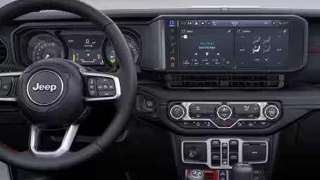 Jaunais Wrangler 4xe Plug-in Hybrid Rubicon aprīkojuma līmenī iepazīstina ar jaunās paaudzes Uconnect™ informācijas un izklaides sistēmu ar 12,3" skārienekrānu, kurā ir integrēta navigācijas sistēma un augstākā līmeņa mobilā savienojamība, pateicoties bezvadu Apple CarPlay™ un Android Auto™ funkcijām.