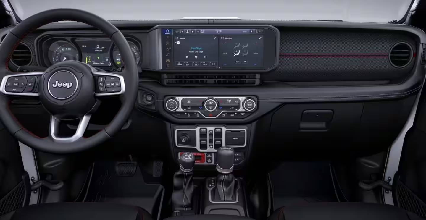 Iebrauciet nākotnē! Jaunajam Wrangler ir jauns un funkcionāls priekšējā paneļa dizains ar 12,3" displeju un Uconnect™ informācijas un izklaides sistēmu.